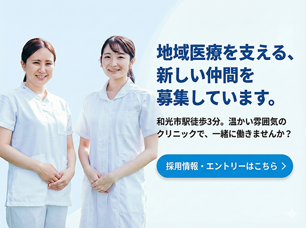 地域住民の方に愛される診療所を標榜し、常に患者さんの立場に立ち、信頼される丁寧な診療を心掛け、スタッフ一同、日夜頑張っております。また、午後の外来は基本的に国立病院機構埼玉病院の医師が担当しております。